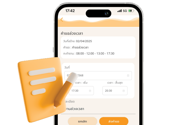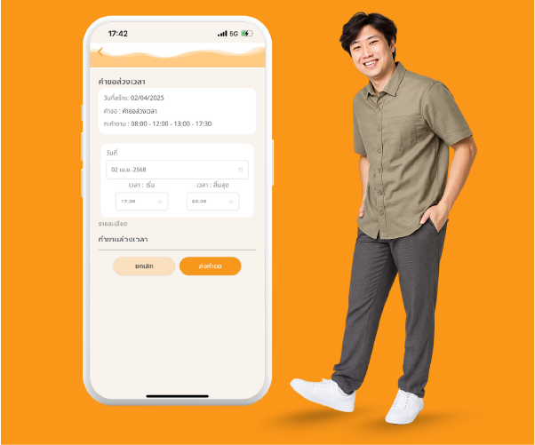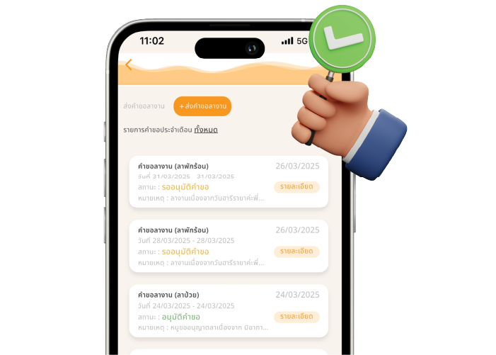 be LEAVE & CLAIM ยื่นคำร้องและขออนุมัติ พนักงานส่งคำร้องเองได้ทันที ผู้อนุมัติรับแจ้งเตือนอัตโนมัติ ทดลองใช้ฟรี 30 วัน รองรับทุกคำขอสำคัญ ที่ใช้บ่อยในทุกองค์กร คำขอลางาน คำขอทำงานOT คำขอทำงาน WFH คำขอรับรองเวลา พนักงาน ยื่นคำขอเองได้ทันที ติดตามสถานะได้คำขอเรียลไทม์ ใช้มือถือเครื่องเดียวจัดการทุกอย่าง พนักงานฝ่ายบุคคล ใช้คำนวณเงินเดือนได้ ข้อมูลคำขอถูกรวบรวมอัตโนมัติ เชื่อมต่อกับระบบอื่นได้ทันที หัวหน้างาน อนุมัติได้เลยจากในแอปฯ แจ้งเตือนอัตโนมัติถึงผู้อนุมัติ และสามารถดูประวัติย้อนหลังได้ในคลิกเดียว นอกจากนี้ ยังเข้าถึงฟีเจอร์นี้ได้ง่าย Mobile App สะดวกทุกที่ ทุกเวลา ดูฟังชันเจ๋ง ๆ เพิ่มเติม เริ่มต้นใช้งานง่าย ยกเลิกได้ทุกเมื่อ ไม่มีบวกเพิ่ม! ทดลองใช้ฟรี 30 วัน