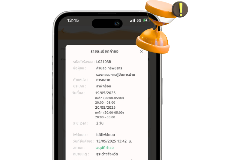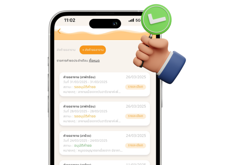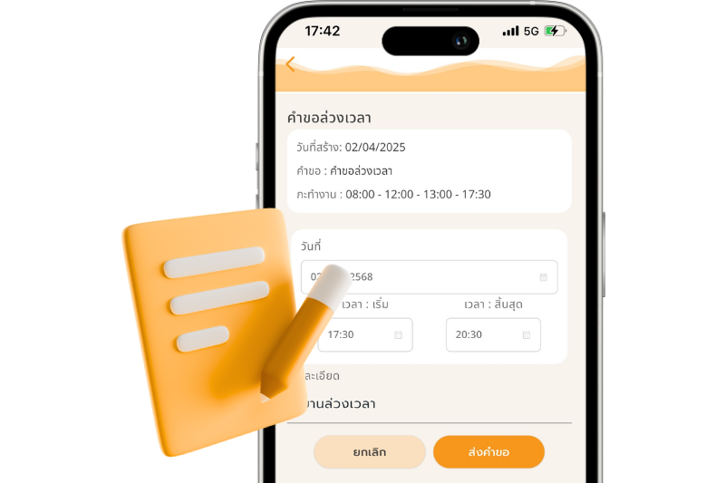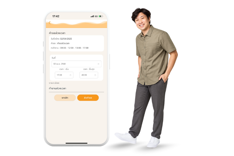 be LEAVE & CLAIM ยื่นคำร้องและขออนุมัติ พนักงานส่งคำร้องเองได้ทันที ผู้อนุมัติรับแจ้งเตือนอัตโนมัติ ทดลองใช้ฟรี 30 วัน รองรับทุกคำขอสำคัญ ที่ใช้บ่อยในองค์กร คำขอลางาน คำขอโอที คำขอเอกสาร คำขอ WFA รับรองเวลา คำขอเปลี่ยนกะ คำขอไหนก็ขออนุมัติได้รวดเร็ว ยื่นคำขอเองได้ทันที ติดตามสถานะได้คำขอเรียลไทม์ ใช้มือถือเครื่องเดียวจัดการทุกอย่าง ซิงก์ข้อมูลกับระบบ ข้อมูลคำขอถูกรวบรวมอัตโนมัติ เชื่อมต่อกับฟีเจอร์อื่นได้ทันที อนุมัติได้เลยจากในแอปฯ แจ้งเตือนอัตโนมัติถึงผู้อนุมัติ และสามารถดูประวัติย้อนหลังได้ในคลิกเดียว เชื่อมต่อกับระบบหลักได้ทันที ดูฟังชันเจ๋ง ๆ เพิ่มเติม เริ่มต้นใช้งานง่าย ยกเลิกได้ทุกเมื่อ ไม่มีบวกเพิ่ม! ทดลองใช้ฟรี 30 วัน