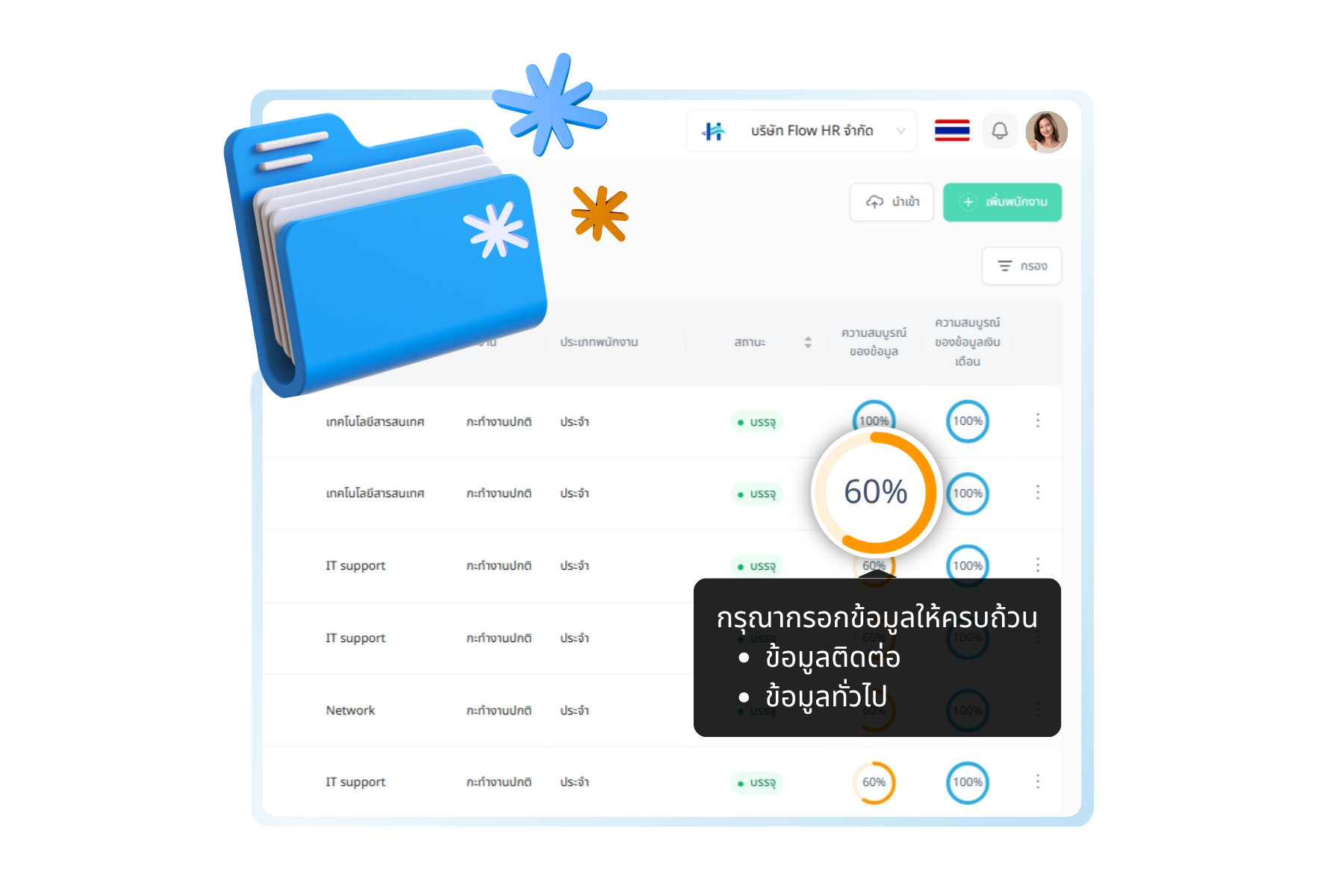 ไม่ต้องเปิดดูทีละคน ระบบแสดงเปอร์เซ็นต์ความสมบูรณ์ของข้อมูล พร้อมระบุชัดเจนว่าขาดอะไร หมดปัญหาข้อมูลตกหล่น ส่งผลต่อการทำงานทั้งระบบ